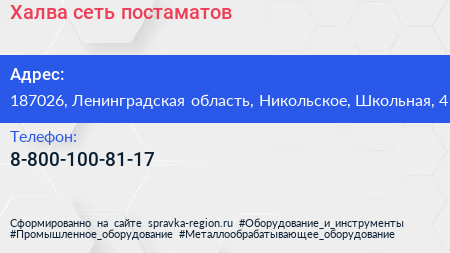 Халва, сеть постаматов по адресу 187026, Ленинградская область, Никольское, Школьная, 4 в дальнейшем Организация, размещена в следующих категориях: