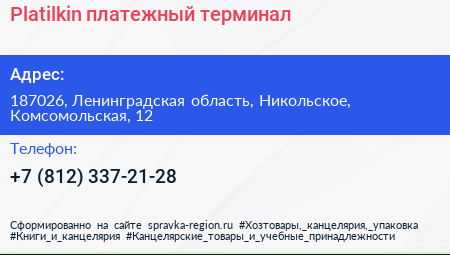 Platilkin, платежный терминал по адресу 187026, Ленинградская область, Никольское, Комсомольская, 12 в дальнейшем Организация, размещена в следующих категориях: