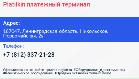 Platilkin, платежный терминал по адресу 187047, Ленинградская область, Никольское, Первомайская, 2а в дальнейшем Организация, размещена в следующих категориях: