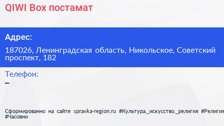 QIWI Box, постамат по адресу 187026, Ленинградская область, Никольское, Советский проспект, 182 в дальнейшем Организация, размещена в следующих категориях: