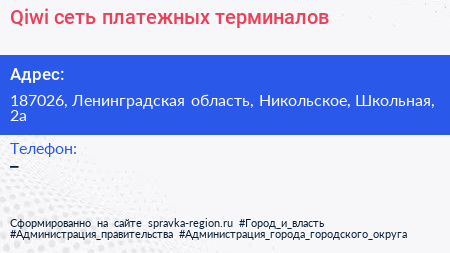 Qiwi, сеть платежных терминалов по адресу 187026, Ленинградская область, Никольское, Школьная, 2а в дальнейшем Организация, размещена в следующих категориях:
