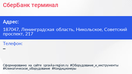 СберБанк, терминал по адресу 187047, Ленинградская область, Никольское, Советский проспект, 217 в дальнейшем Организация, размещена в следующих категориях: