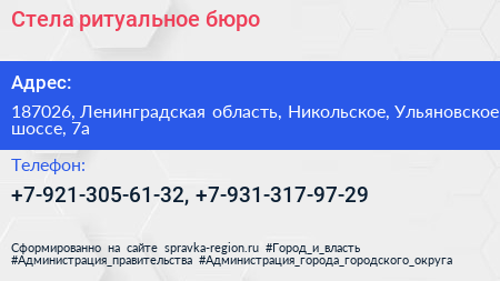 Стела, ритуальное бюро по адресу 187026, Ленинградская область, Никольское, Ульяновское шоссе, 7а в дальнейшем Организация, размещена в следующих категориях: