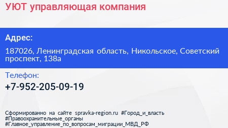 УЮТ, управляющая компания по адресу 187026, Ленинградская область, Никольское, Советский проспект, 138а в дальнейшем Организация, размещена в следующих категориях: