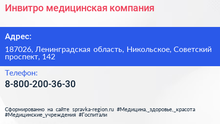 Инвитро, медицинская компания по адресу 187026, Ленинградская область, Никольское, Советский проспект, 142 в дальнейшем Организация, размещена в следующих категориях: