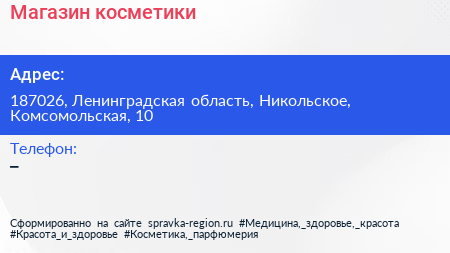 Магазин косметики по адресу 187026, Ленинградская область, Никольское, Комсомольская, 10 в дальнейшем Организация, размещена в следующих категориях: