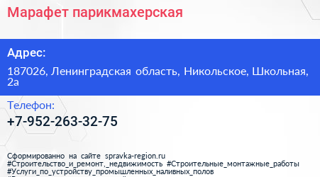 Марафет, парикмахерская по адресу 187026, Ленинградская область, Никольское, Школьная, 2а в дальнейшем Организация, размещена в следующих категориях: