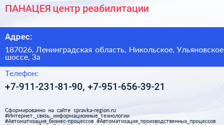 ПАНАЦЕЯ, центр реабилитации по адресу 187026, Ленинградская область, Никольское, Ульяновское шоссе, 3а в дальнейшем Организация, размещена в следующих категориях: