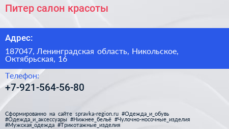 Питер, салон красоты по адресу 187047, Ленинградская область, Никольское, Октябрьская, 16 в дальнейшем Организация, размещена в следующих категориях: