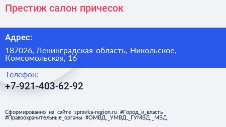 Престиж, салон причесок по адресу 187026, Ленинградская область, Никольское, Комсомольская, 16 в дальнейшем Организация, размещена в следующих категориях: