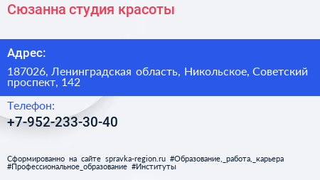 Сюзанна, студия красоты по адресу 187026, Ленинградская область, Никольское, Советский проспект, 142 в дальнейшем Организация, размещена в следующих категориях: