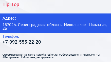Tip Top по адресу 187026, Ленинградская область, Никольское, Школьная, 2Б в дальнейшем Организация, размещена в следующих категориях: