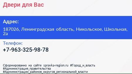 Двери для Вас по адресу 187026, Ленинградская область, Никольское, Школьная, 2а в дальнейшем Организация, размещена в следующих категориях: