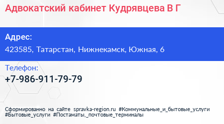 Адвокатский кабинет Кудрявцева В.Г. по адресу 423585, Татарстан, Нижнекамск, Южная, 6 в дальнейшем Организация, размещена в следующих категориях: