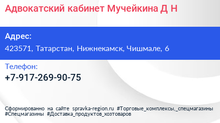 Адвокатский кабинет Мучейкина Д.Н. по адресу 423571, Татарстан, Нижнекамск, Чишмале, 6 в дальнейшем Организация, размещена в следующих категориях: