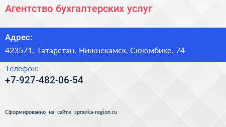 Агентство бухгалтерских услуг по адресу 423571, Татарстан, Нижнекамск, Сююмбике, 74 в дальнейшем Организация, размещена в следующих категориях: