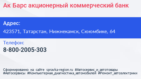 Ак Барс, акционерный коммерческий банк по адресу 423571, Татарстан, Нижнекамск, Сююмбике, 64 в дальнейшем Организация, размещена в следующих категориях: