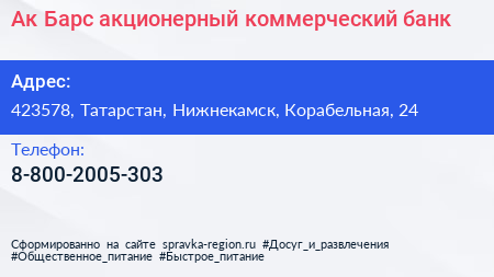 Ак Барс, акционерный коммерческий банк по адресу 423578, Татарстан, Нижнекамск, Корабельная, 24 в дальнейшем Организация, размещена в следующих категориях: