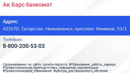 Ак Барс, банкомат по адресу 423570, Татарстан, Нижнекамск, проспект Химиков, 53/1 в дальнейшем Организация, размещена в следующих категориях: