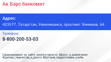 Ак Барс, банкомат по адресу 423577, Татарстан, Нижнекамск, проспект Химиков, 64 в дальнейшем Организация, размещена в следующих категориях: