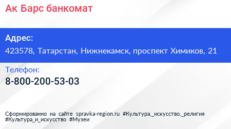 Ак Барс, банкомат по адресу 423578, Татарстан, Нижнекамск, проспект Химиков, 21 в дальнейшем Организация, размещена в следующих категориях: