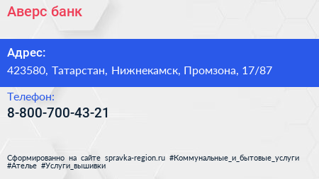 Аверс, банк по адресу 423580, Татарстан, Нижнекамск, Промзона, 17/87 в дальнейшем Организация, размещена в следующих категориях: