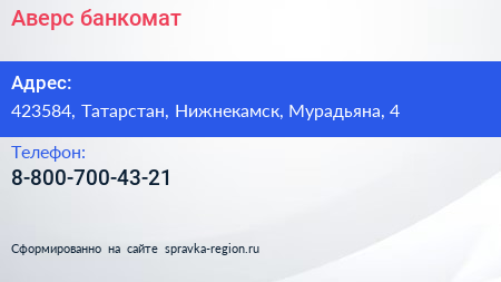 Аверс, банкомат по адресу 423584, Татарстан, Нижнекамск, Мурадьяна, 4 в дальнейшем Организация, размещена в следующих категориях: