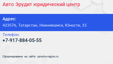 Авто Эрудит, юридический центр по адресу 423576, Татарстан, Нижнекамск, Юности, 15 в дальнейшем Организация, размещена в следующих категориях: