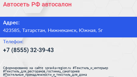 Автосеть.РФ, автосалон по адресу 423585, Татарстан, Нижнекамск, Южная, 5г в дальнейшем Организация, размещена в следующих категориях: