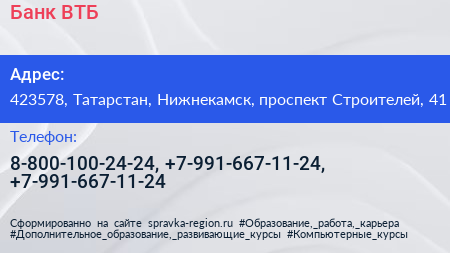 Банк ВТБ по адресу 423578, Татарстан, Нижнекамск, проспект Строителей, 41 в дальнейшем Организация, размещена в следующих категориях: