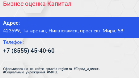 Бизнес-оценка Капитал по адресу 423599, Татарстан, Нижнекамск, проспект Мира, 58 в дальнейшем Организация, размещена в следующих категориях: