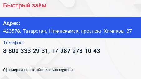 Быстрый заём по адресу 423578, Татарстан, Нижнекамск, проспект Химиков, 37 в дальнейшем Организация, размещена в следующих категориях: