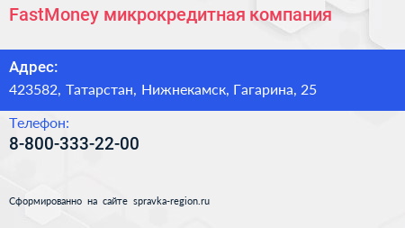 FastMoney, микрокредитная компания по адресу 423582, Татарстан, Нижнекамск, Гагарина, 25 в дальнейшем Организация, размещена в следующих категориях: