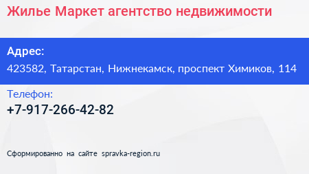 Жилье Маркет, агентство недвижимости по адресу 423582, Татарстан, Нижнекамск, проспект Химиков, 114 в дальнейшем Организация, размещена в следующих категориях: