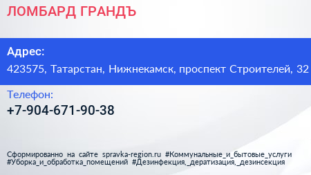 ЛОМБАРД ГРАНДЪ по адресу 423575, Татарстан, Нижнекамск, проспект Строителей, 32 в дальнейшем Организация, размещена в следующих категориях: