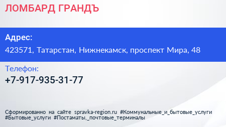 ЛОМБАРД ГРАНДЪ по адресу 423571, Татарстан, Нижнекамск, проспект Мира, 48 в дальнейшем Организация, размещена в следующих категориях: