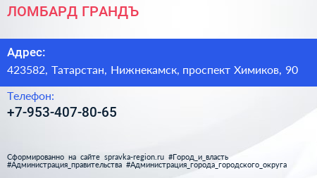 ЛОМБАРД ГРАНДЪ по адресу 423582, Татарстан, Нижнекамск, проспект Химиков, 90 в дальнейшем Организация, размещена в следующих категориях: