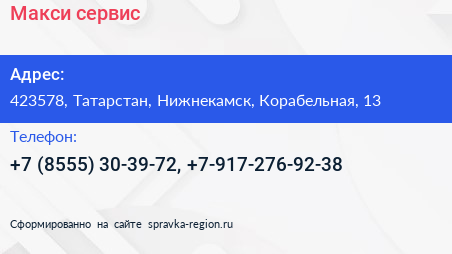 Макси-сервис по адресу 423578, Татарстан, Нижнекамск, Корабельная, 13 в дальнейшем Организация, размещена в следующих категориях: