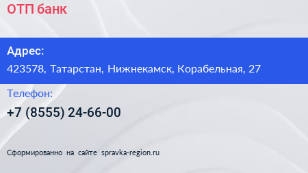 ОТП банк по адресу 423578, Татарстан, Нижнекамск, Корабельная, 27 в дальнейшем Организация, размещена в следующих категориях: