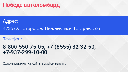 Победа, автоломбард по адресу 423579, Татарстан, Нижнекамск, Гагарина, 6а в дальнейшем Организация, размещена в следующих категориях: