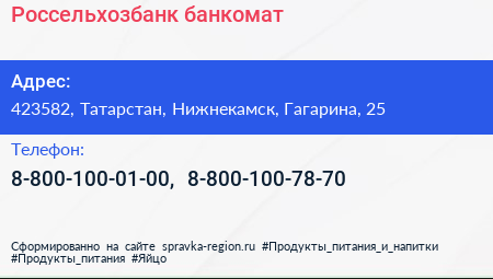 Россельхозбанк, банкомат по адресу 423582, Татарстан, Нижнекамск, Гагарина, 25 в дальнейшем Организация, размещена в следующих категориях: