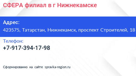 СФЕРА, филиал в г. Нижнекамске по адресу 423575, Татарстан, Нижнекамск, проспект Строителей, 18 в дальнейшем Организация, размещена в следующих категориях:
