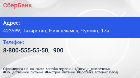 СберБанк по адресу 423599, Татарстан, Нижнекамск, Чулман, 17а в дальнейшем Организация, размещена в следующих категориях:
