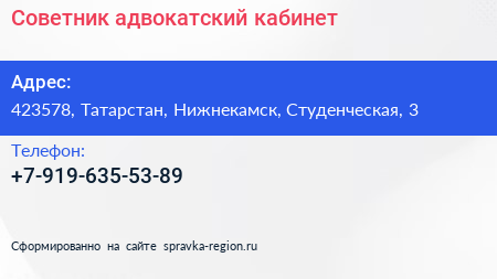 Советник, адвокатский кабинет по адресу 423578, Татарстан, Нижнекамск, Студенческая, 3 в дальнейшем Организация, размещена в следующих категориях: