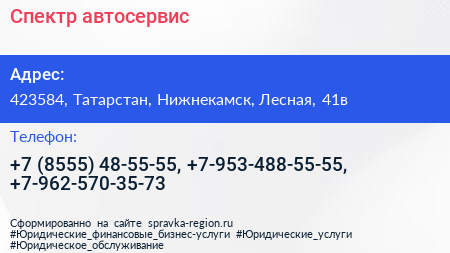 Спектр, автосервис по адресу 423584, Татарстан, Нижнекамск, Лесная, 41в в дальнейшем Организация, размещена в следующих категориях: