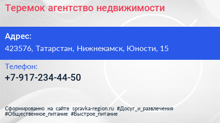Теремок, агентство недвижимости по адресу 423576, Татарстан, Нижнекамск, Юности, 15 в дальнейшем Организация, размещена в следующих категориях: