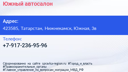 Южный, автосалон по адресу 423585, Татарстан, Нижнекамск, Южная, 3в в дальнейшем Организация, размещена в следующих категориях:
