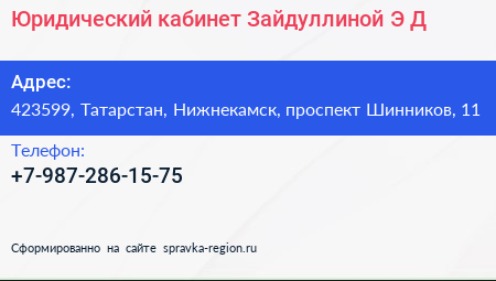 Юридический кабинет Зайдуллиной Э.Д. по адресу 423599, Татарстан, Нижнекамск, проспект Шинников, 11 в дальнейшем Организация, размещена в следующих категориях: