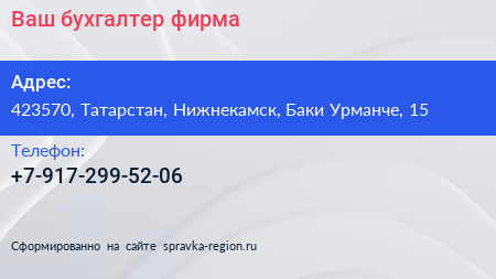 Ваш бухгалтер, фирма по адресу 423570, Татарстан, Нижнекамск, Баки Урманче, 15 в дальнейшем Организация, размещена в следующих категориях: