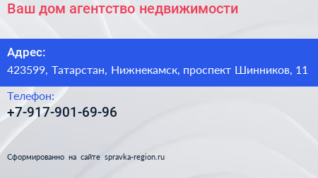 Ваш дом, агентство недвижимости по адресу 423599, Татарстан, Нижнекамск, проспект Шинников, 11 в дальнейшем Организация, размещена в следующих категориях: